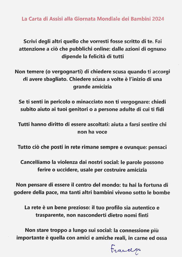 Probabilmente con una rivisitazione della Carta di Assisi si potrebbe iniziare a creare una sorta di filo conduttore con i bambini per aiutarli a crescere, facendo capire direttamente ai bambini con parole semplici i comportamenti che bisogna assumere nelle svariate condizioni; ovviamente segnalando che i genitori sono la loro forza e che a loro e agli adulti che hanno vicino, di chiedere sempre consigli su cosa fare in certe situazioni, per scegliere bene, ma con un occhio molto vigile sui sistemi di comunicazione che si utilizzano, ed iniziare, col pensiero di non fare agli altri ciò che non si vuole che venga fatto a se stessi già da piccoli, perché l’informazione è importante e deve essere guidata da valori essenziali se vogliamo il rispetto dei diritti umani, una valutazione per far comprendere i principali concetti di convivenza ed il valore etico di un linguaggio più semplice che tenga conto dei valori e delle persone già da bambini per farli divenire domani grandi uomini