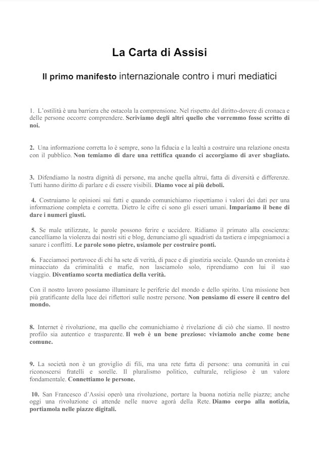 Il documento di Assisi, che fa esplicito richiamo all’incontro interreligioso voluto da San Giovanni Paolo II nel 1986, consta di dieci punti. Un Carta “che serve ad ispirare” come ha sottolineato padre Spadaro, ma non per questo meno importante di tanti altri documenti deontologici. Quello che si chiede ai giornalisti è quindi di: scrivere degli altri quello che si vorrebbe scritto di se stessi; non temere di dare una rettifica quando ci si accorge di aver sbagliato; dare voce ai più deboli difendendone la dignità; imparare il bene di dare i numeri e i dati giusti; usare le parole per costruire ponti e non muri; proteggere la verità dei fatti narrati; non essere autoreferenziali; usare bene il Web; mettere in contatto le persone; dare corpo e sostanza a tutte le notizie. La responsabilità di usare le parole per costruire e diffondere il bene è stata sottolineata anche dall'imam di Roma, Saleh Ramadan Elsayed, che ha affermato che la religione è l'amore, la tolleranza e la pace.